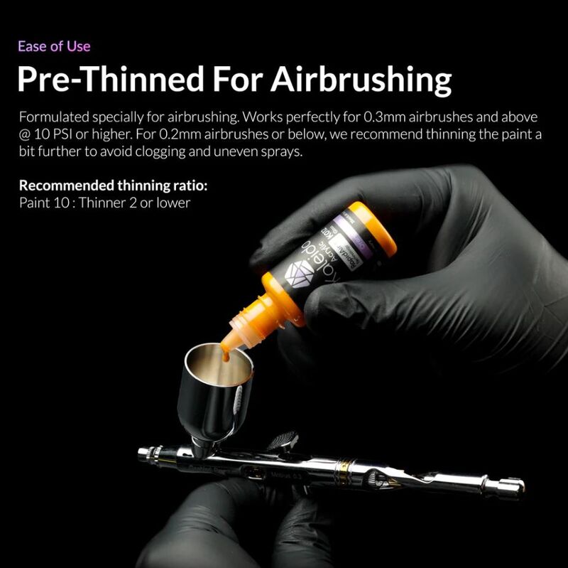 • Las pinturas Kaleido son acrílicos a base de agua prediluidos, listos para usar directamente desde el frasco con aerógrafos de 0,3 a 0,5 mm.
