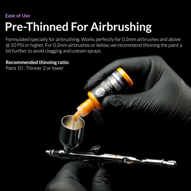 • Las pinturas Kaleido son acrílicos a base de agua prediluidos, listos para usar directamente desde el frasco con aerógrafos de 0,3 a 0,5 mm.