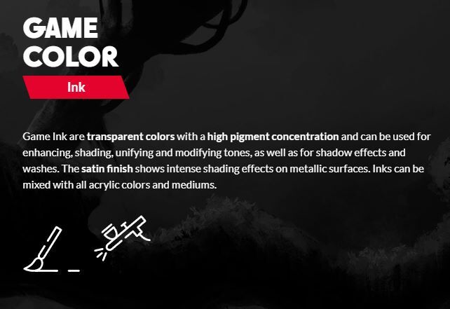 Las tintas son colores transparentes, con elevada concentración de pigmento y se emplean para potenciar, matizar, unificar y modificar los tonos. Además, permiten generar efectos de sombreado y aguadas. Su acabado satinado permite realizar sombreados intensos sobre superficies metalizadas. Las tintas se pueden mezclar con todos los colores y médiums acrílicos.