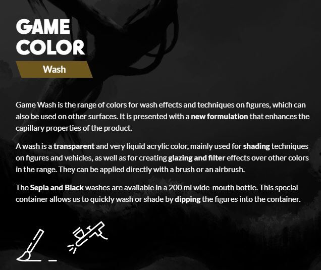 Game Wash es la gama de colores para efectos y técnicas de lavado sobre figuras, que también se pueden utilizar sobre otros soportes y se presenta con una nueva formulación que mejora las propiedades de capilaridad del producto.